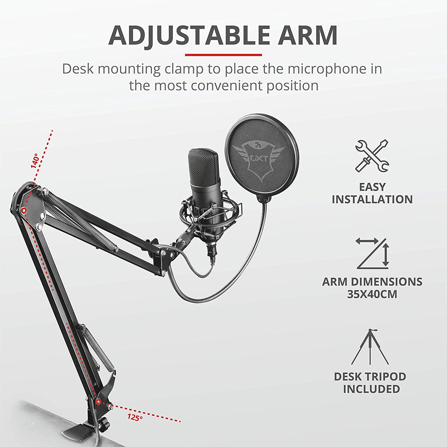 Morsetto di montaggio a tavolo regolabile, per sistemare il microfono nel punto più comodo. Comprende shock-mount di alta fascia, filtro pop a doppio schermo e treppiede.